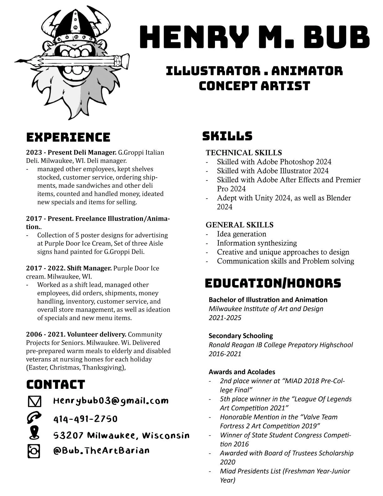 Hey hey hey! I am an Illustrator, Concept artist, and studying Animator who has a passion for Character Design and telling stories. I am currently attending Milwaukee Institute of Art and Design to achieve my B.F.A in Illustration through the Animation Track.